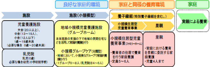 平成28年の児童福祉法改正では、代替養育(子どもを保護者が分離している場合)に関し、「児童を家庭において養育することが困難であり又は適当でない場合にあつては児童が家庭における養育環境と同様の養育環境において継続的に養育されるよう、児童を家庭及び当該養育環境において養育することが適当でない場合にあつては児童ができる限り良好な家庭的環境において養育されるよう、必要な措置を講じなければならない。」と規定されました(児童福祉法3条の2)。